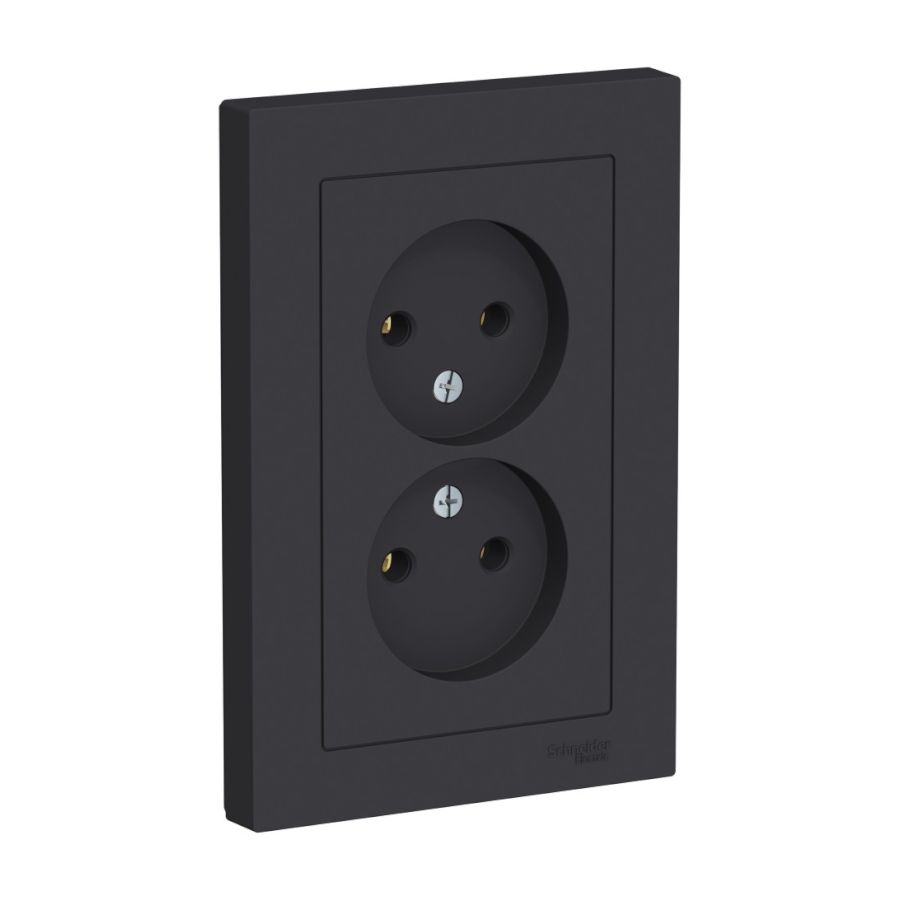 Розетка двойная Schneider Electric AtlasDesign (в сборе, цвет карбон) без заземления и без шторок подходит для сетей 250 В, на ток 16 А. - Лицевые детали из качественного ABS-пластика, устойчивого к царапинам и УФ-излучению. - Двойная розетка позволяет подключить два устройства в одном месте. - Изделие поставляется в комплекте с рамкой того же цвета. - Благодаря покрытию «soft touch» к изделию приятно прикасаться.